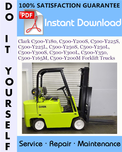 This is the COMPLETE factory Service Repair Workshop Manual for the Clark C500-Y180, C500-Y200S, C500-Y225S, C500-Y225L, C500-Y250S, C500-Y250L, C500-Y300S, C500-Y300L, C500-Y350, C500-Y165M, C500-Y200M Forklift Trucks. This manual is very detailed and contains information and data to this model. has specs, diagrams, and actual real photo illustrations, and schemes. which give you complete step by step operations on repair, assembly, disassembly, Diagnosing, servicing, technical maintenance & troubleshooting procedures for your machine.