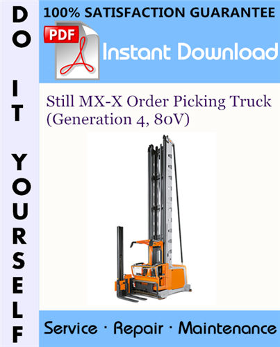 This is the COMPLETE factory Service Repair Workshop Manual for the Still MX-X Order Picking Truck (Generation 4, 80V). This manual is very detailed and contains information and data to this model. has specs, diagrams, and actual real photo illustrations, and schemes. which give you complete step by step operations on repair, assembly, disassembly, Diagnosing, servicing, technical maintenance & troubleshooting procedures for your machine.