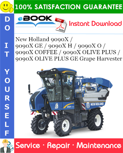 This is the COMPLETE Service Repair Manual for the New Holland 9090X / 9090X GE / 9090X H / 9090X O / 9090X COFFEE / 9090X OLIVE PLUS / 9090X OLIVE PLUS GE Grape Harvester. It contains deep information about maintaining, assembly, disassembly and servicing your New Holland Grape Harvester.