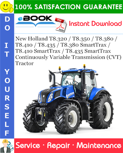 This is the COMPLETE Service Repair Manual for the New Holland T8.320 / T8.350 / T8.380 / T8.410 / T8.435 / T8.380 SmartTrax / T8.410 SmartTrax / T8.435 SmartTrax Continuously Variable Transmission (CVT) Tractor. It contains deep information about maintaining, assembly, disassembly and servicing your New Holland Tractor.