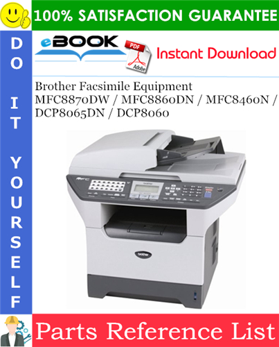 This is the COMPLETE Parts Reference List for the Brother Facsimile Equipment MFC8870DW / MFC8860DN / MFC8460N / DCP8065DN / DCP8060. Designed for the repair shops and individuals when ordering parts for their Brother Facsimile Equipment. This Manual describes and illustrates assemblies, subassemblies, and detail parts needed for service replacement. it Covers every part of your Brother Facsimile Equipment inside and out. Tons of pictures and diagrams at your fingertips!