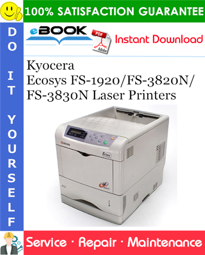 This is the COMPLETE Service Repair Manual for the Kyocera Ecosys FS-1920/FS-3820N/FS-3830N Laser Printers. It contains deep information about maintaining, assembly, disassembly and servicing your Kyocera Ecosys FS-1920/FS-3820N/FS-3830N Laser Printers. It also includes the Parts Catalog manual which describes and illustrates assemblies, subassemblies, and detail parts needed for service replacement.