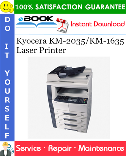This is the COMPLETE Service Repair Manual for the Kyocera KM-2035/KM-1635 Laser Printer. It contains deep information about maintaining, assembly, disassembly and servicing your Kyocera KM-2035/KM-1635 Laser Printer. It also includes the Parts Catalog manual which describes and illustrates assemblies, subassemblies, and detail parts needed for service replacement.