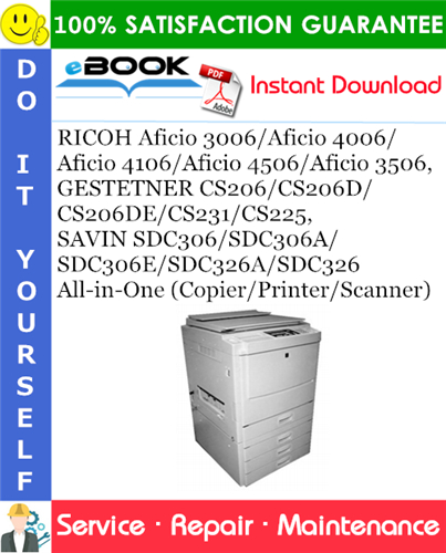This is the COMPLETE Service Repair Manual for the RICOH Aficio 3006/Aficio 4006/Aficio 4106/Aficio 4506/Aficio 3506, GESTETNER CS206/CS206D/CS206DE/CS231/CS225, SAVIN SDC306/SDC306A/SDC306E/SDC326A/SDC326 All-in-One (Copier/Printer/Scanner). It contains deep information about maintaining, assembly, disassembly and servicing your RICOH/GESTETNER/SAVIN machinery. It also includes the Parts Catalog manual which describes and illustrates assemblies, subassemblies, and detail parts needed for service replacement.