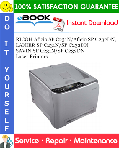 This is the COMPLETE Service Repair Manual for the RICOH Aficio SP C231N/Aficio SP C232DN, LANIER SP C231N/SP C232DN, SAVIN SP C231N/SP C232DN Laser Printers. It contains deep information about maintaining, assembly, disassembly and servicing your RICOH/LANIER/SAVIN machinery. It also includes the Parts Catalog manual which describes and illustrates assemblies, subassemblies, and detail parts needed for service replacement.