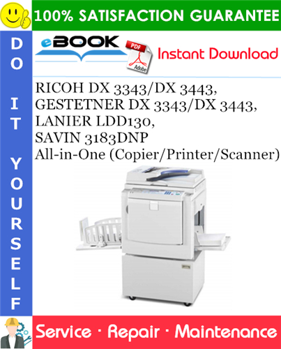 This is the COMPLETE Service Repair Manual for the RICOH DX 3343/DX 3443, GESTETNER DX 3343/DX 3443, LANIER LDD130, SAVIN 3183DNP All-in-One (Copier/Printer/Scanner). It contains deep information about maintaining, assembly, disassembly and servicing your RICOH/GESTETNER/LANIER/SAVIN machinery. It also includes the Parts Catalog manual which describes and illustrates assemblies, subassemblies, and detail parts needed for service replacement.