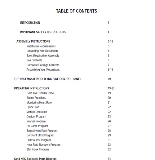 PaceMaster Gold XRC Recumbent Bike Owner Manual