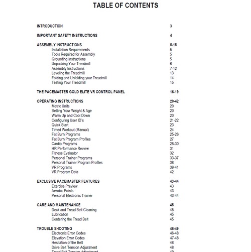 PaceMaster Gold Elite VR - Fold Up Treadmill Owner Manual