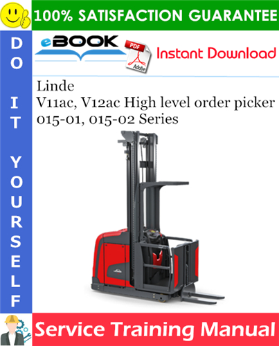 This is the COMPLETE Service Training Manual for the Linde High Level Order Picker Type 015-01, 015-02; Models V11ac, V12ac. This manual provides detailed service information, step-by-step repair instruction and maintenance specifications. it has been prepared as an aid to improve the quality of repairs by giving the operator an accurate understanding of the product and by showing him the correct way to perform repairs and make judgements. YOU CAN DO THE REPAIRS YOURSELF AND SAVE MONEY $$$