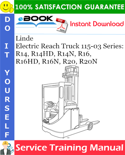 This is the COMPLETE Service Training Manual for the Linde Electric Reach Truck 115-03 Series: R14, R14HD, R14N, R16, R16HD, R16N, R20, R20N. This manual provides detailed service information, step-by-step repair instruction and maintenance specifications. it has been prepared as an aid to improve the quality of repairs by giving the operator an accurate understanding of the product and by showing him the correct way to perform repairs and make judgements. YOU CAN DO THE REPAIRS YOURSELF AND SAVE MONEY $$$