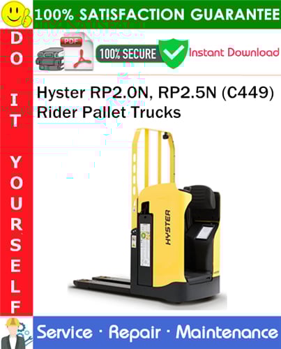 This manual contains high quality images, specs and Schematics, actual real photo illustrations, circuit diagrams and instructions to help you to operate, diagnostic, maintenance, troubleshoot, and repair your Hyster RP2.0N, RP2.5N (C449) Rider Pallet Trucks. This document is printable, without restrictions, contains searchable text, bookmarks, crosslinks for easy navigation.