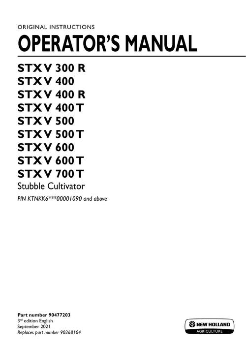 NEW HOLLAND NEW HOLLAND STX V 300 400 500 600 700 T R STX V TUBBLE CULTIVATOR OPERATORS MANUAL
