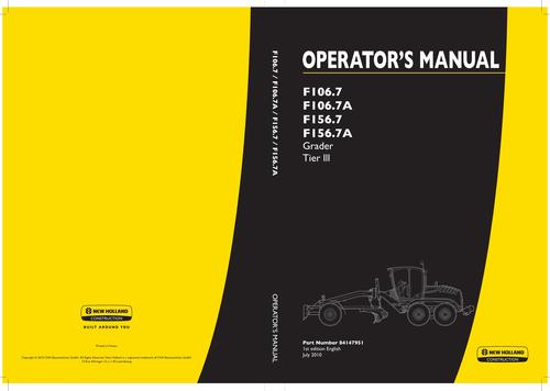 NEW HOLLAND F106.7 F106.7A F156.7 F156.7A TIER III 3 MOTOR GRADER OPERATORS MANUAL