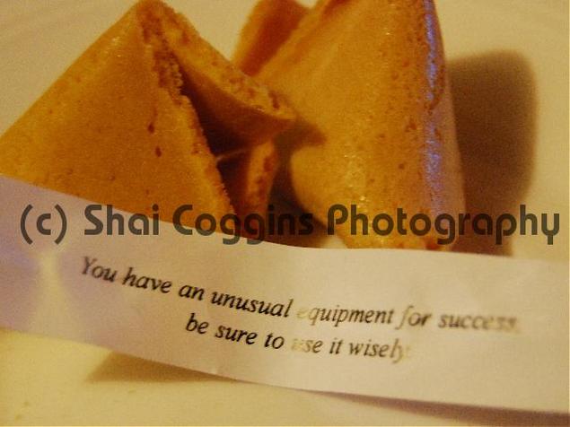 A coloured photo of a fortune cookie with the text: "You have an unusual equipment for success, be sure to use it wisely."
