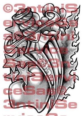 Tattoo flashes of a Dagger with Heart, Stars and Flames created by a tattoo designer.