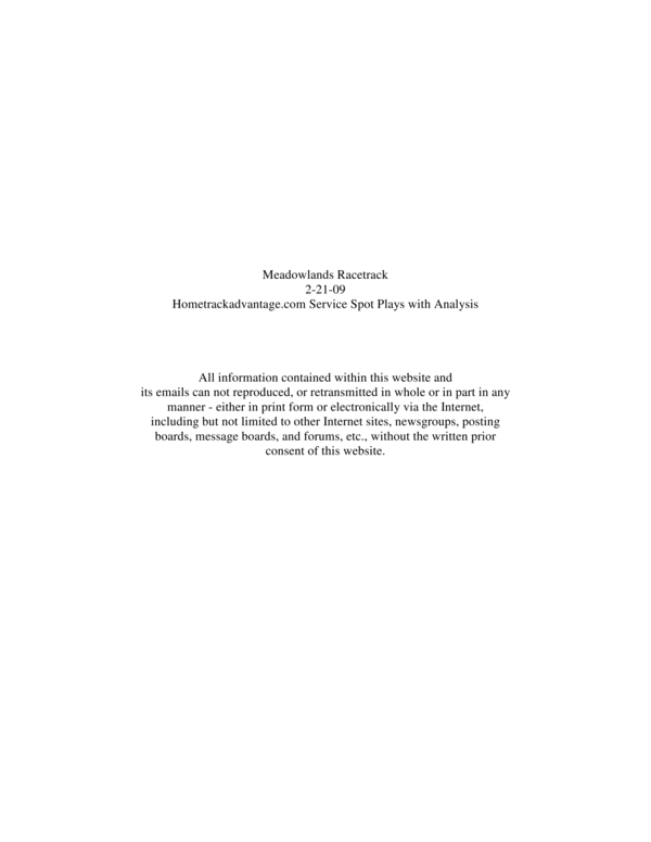 Hometrackadvantage.com Service Spot Plays with Analysis for The Meadowlands 2-21-09