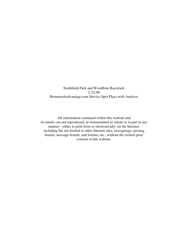 Hometrackadvantage.com Service Spot Plays with Analysis for Woodbine Racetrack and Northfield Park 2-23-09