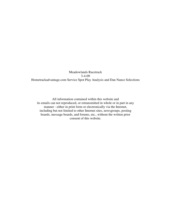 Hometrackadvantage.com Service Spot Plays with Analysis and Dan Nance Selections Meadowlands 3-4-09
