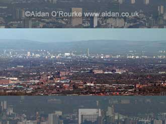 View of Manchester from Winter Hill, north west of Bolton, some 12 miles north west of the city centre. All the main buildings are visible, with the Pennines rising up in the south east.