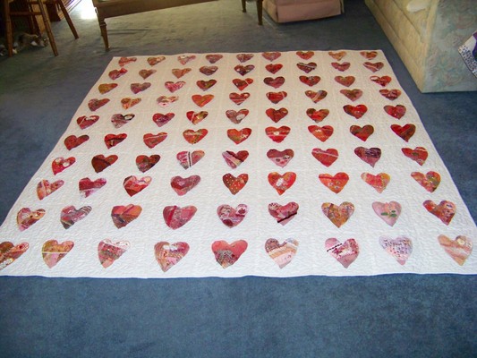 Quilt by Erin Lale. Erin Lale is magicalrealistartist on both eBay and tradebit, and this listing is by the artist. The hearts on this crazy quilt are all made of Erin\\s hand dyed fabrics, and are all hand embellished.
