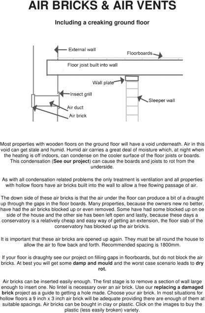 Most properties with wooden floors on the ground floor will have a void underneath. Air in this void can get stale and humid. Humid air carries a great deal of moisture which, at night when the heating is off indoors, can condense on the cooler surface of the floor joists or boards. This condensation (See our project) can cause the boards and joists to rot from the underside.