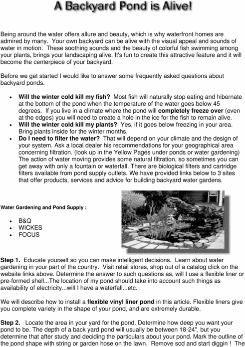 Being around the water offers allure and beauty, which is why waterfront homes are admired by many. Your own backyard can be alive with the visual appeal and sounds of water in motion. These soothing sounds and the beauty of colorful fish swimming among your plants, brings your landscaping alive. It\'s fun to create this attractive feature and it will become the centerpiece of your backyard.