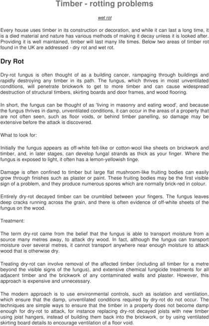 Every house uses timber in its construction or decoration, and while it can last a long time, it is a died material and nature has various methods of making it decay unless it is looked after. Providing it is well maintained, timber will last many life times. Below two areas of timber rot found in the UK are addressed - dry rot and wet rot.