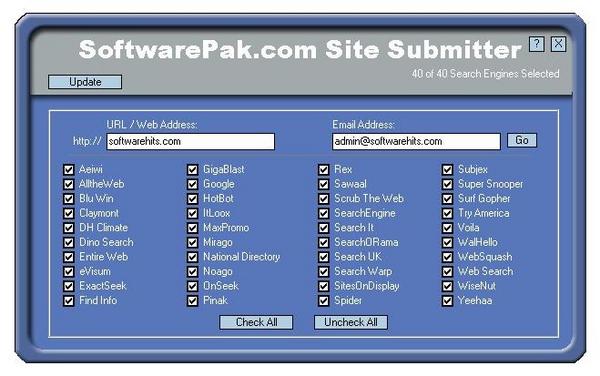 Our website submission software makes it easy to submit (and then resubmit each month) your websites to 40 of the top search engines. Click a button....wait 10 seconds...and you\'re done. Don\'t pay others to do what you can do for yourself! The Software engine Database is constantly updated and always availagble for FREE so you can rest assured your software submissions are always current!