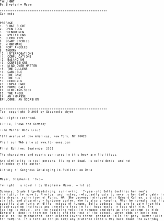 The first of the Twilight Saga by Stephenie Meyer. A girl Bella falls in love with a vampire Edward.