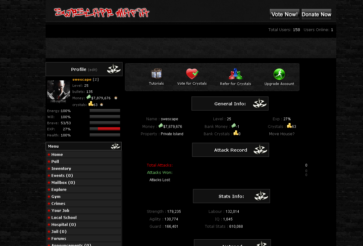 In the top right corner of the screen is your personal information. This shows your current name, amount of cash, level, and number of crystals. To the right of your personal info is your status bars. These show your current energy, will, brave, experience, and health. 1)Energy is used for training and https://www.tradebit.comills 8% every 5 minutes, or 17% every 5 minutes for donators, 2)Will determines the effectiveness of your training, 3)Brave is used to do crimes, different crimes take more brave to do, these crimes are harder to succeed at so be careful not to try them to soon. 4)Experience shows how close you are to leveling up. 5)Health shows how much health you have remaining. You lose this if you\\\\\\re hit in a fight.