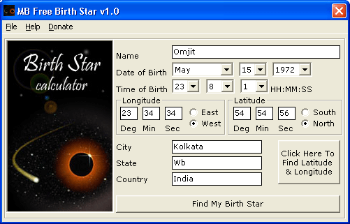 MB Birth Star tells you what your birth star is, and much more. Based on Vedic astrology, this simple program requires a lot of personal information, but rewards you with an in-depth look at your life. This programs interface is simple to navigate, even though the information required might take some online research. The link to help users find the longitude and latitude of their births is clunky and not a good addition. However, the results page is intuitive, with its collection of tabs and descriptions presented in laymans terms. In addition, there is a Help file for users who need guidance, though it doesnt cover astrology. The program requires you input your birthday, the longitude and latitude of your birthplace, and the time zone and time of your birth to get an accurate reading. From there, your are shown your results, which are displayed in five different tabs focusing on the characteristics of the star sign, negative human traits, positive human traits, career and domestic traits, and physical traits. Everything is written with a minimum of astrological jargon so that any level of user can comprehend.