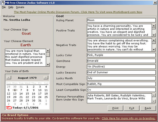 MB Chinese Zodiac Software provides users with a chance to learn everything about their Chinese signs. The program is simple and has excellent results. MB Chinese Zodiac Softwares interface is very simple and focuses primarily on a few boxes and pull-down menus that users will intuitively navigate through. The results page is simple to read and to understand, so much so that we are confident even novice users will not need to utilize the online Help file to fully appreciate this download. The program functions very intuitively. After entering your name, birthday, and sex, users are taken to a screen that highlights every imaginable angle of their Chinese Zodiac sign. From elements, ruling planets, negative and positive characteristics, lucky colors and more, this program explains the idiosyncrasies of each sign in great detail and in simple language that all users can enjoy. The program did a fine job of dissecting each Chinese sign, and we felt it didnt hold anything back. Users who are curious about what their birthday means according to the Chinese Zodiac will find this freeware download to be very helpful.