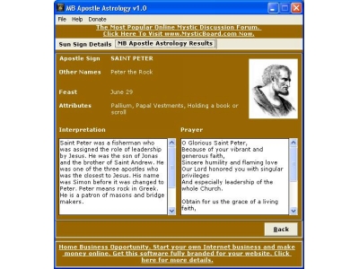 MB Apostle Astrology software does apostle astrology analysis for you and tells you which of the 12 apostles represent your personality. If you use this free tool for apostle astrology reading you will come to know about the attributes of the apostles. As a result you will be able to find the relationship between the characteristic features of your sun sign and the apostle who stands for your personality. Apostle astrology has as its basis the myth of the 12 apostles of Jesus Christ. These twelve apostles of Christ are associated with the 12 astrology sun signs or zodiac signs, depending upon the similarities of characteristics as well as attributes. The 12 apostles of the Christ are St. Andrew, St. Bartholomew, St. James the Greater, St. James the Lesser, St. John, St. Jude, St. Matthew, St. Peter, St. Philip, St. Simon and St. Thomas. Apart from knowing the apostle name that represents your personality, MB Apostle Astrology Software also lets you know the prayers that are specially associated with the apostles. The apostle reading or the apostle astrology details for you also includes your sun sign details from which you can know your lucky color, lucky number, suitable gemstone and also interpretation of the positive and negative traits of your character.