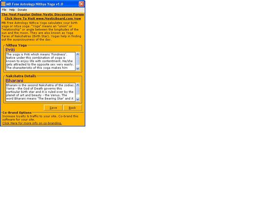 MB Astrology Nithya Yoga calculates your birth yoga or nitya yoga. "Yoga" means an "union" or "relationship" or angle between the longitudes of the sun and the moon. They are also known as Yoga Taras of Nakshatras (Birth Star). Yogas help in finding out the auspiciousness of the day. MB Free Astrology Nithya Yoga helps you find the ruling yoga at the time of your birth. The Yoga of a person represents his characteristics and nature.
