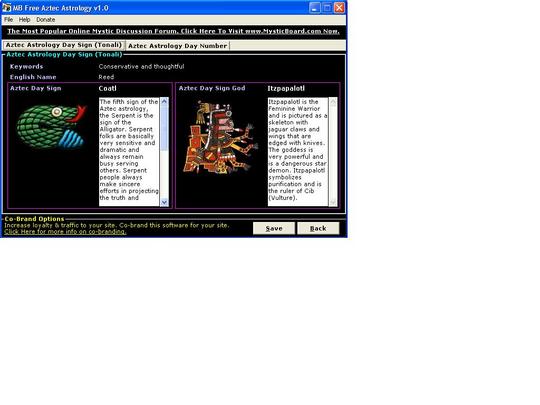 MB Aztec Astrology Software determines your Aztec Day Sign from your date of birth. This program gives you a detailed interpretation of the day sign you belong to as per the astrological culture of Aztec. The program tells you about your positive and negative characteristic traits, your personality in general thus helping you to improve yourself for the better.