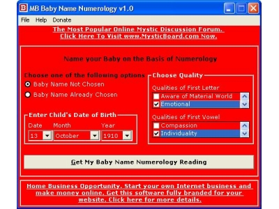 MB Baby Name Numerology does baby name numerology analysis and gives you an insight into the characteristic features and personality traits of your child. Using this free tool for baby name numerology interpretation, you also get the scope to choose a name for your child that could influence his nature and basic tendencies in such a way that it would include the virtues you want your son or daughter to have. You can get an idea about the letters or the alphabet that should be there in the name of your child, considering the associated attributes of the alphabet. The alphabet in a name have the ability to influence the nature, habits and a number of personality traits of a person in many ways. Therefore, the name you choose for your baby has a certain kind of influence on your child. You can know these features by getting a free baby name numerology reading from MB Baby Name Numerology Software. MB Baby Name Numerology Software is reputed for its simplicity in functioning. The thorough instructions to run this wonderful free tool for baby name numerology analysis are available in the help page.