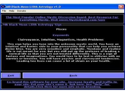 MB Black Moon Lilith Astrology calculates your Black Moon Lilith sign. Black Moon Lilith is a sign of sensuality, strength, independence and your need for rebellion. It stands for all the negative feelings that we feel towards people and circumstances. MB Black Moon Lilith Astrology Software is an extraordinary software that explains the influence of lilith or the black moon and finds out the negative aspects of your nature character and personality traits. This black moon software or Lilith software finds the position of Lilith or the black moon or the dark moon in your astrology natal chart and does a black moon analysis. The black moon analysis gives an insight into the negative attributes in your nature and character, some of which are innate and instinctive in you. If you are interested to know the dark side of your nature and personality, you just need to download MB Black Moon Lilith Astrology Software and get a black moon astrology analysis or Lilith astrology reading. The Lilith point or the black moon point is in the ecliptic path of the moon. The axis of apogee is formed when the moons orbit is at the furthest distance from the earth and the axis of perigee. Lilith or black moon is an empty area, with a movement pace of nearly 40 degrees a year, taking nearly nine years for the completion of a single course of it. Getting a Lilith astrology analysis, knowing your Lilith sign or black moon sign and also getting an insight into the dark side of your nature and personality by using MB Black Moon Lilith Astrology Software is very easy.