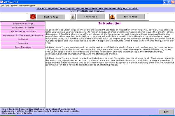 Yoga is one of the most ancient practices of meditation which helps you to keep yourself calm and your mind peaceful. Yoga can well transform these emotional traits into peacefulness thus enabling an individual to enjoy good and vibrant health. MB Yoga provides an individual with information on the ways of practicing the different Yoga Asanas the different Chakras associated with Yoga Asanas and also the Yoga associated with a persons sun sign. In this software the yoga images are clear and easy to understand. Moreover, the ways of practicing the different mudras have also been described in a precise manner. Following the software, it will not be difficult even for a novice to know which yogasana to practice to open his under active or over active chakra.